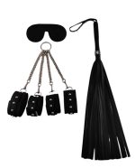 Siyah Fetish Fantezi Seti – 4’lü Kelepçe Kırbaç Göz Bandı