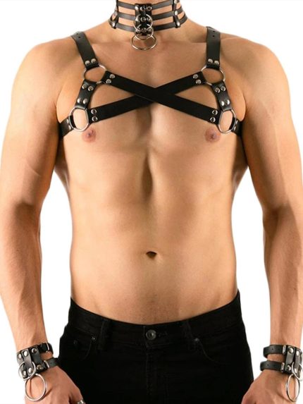 Erkekler İçin Siyah Deri Harness Takımı Göğüs, Boyunluk ve Bileklik Seti